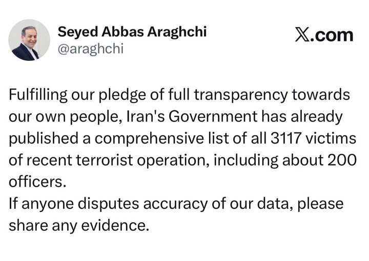 به گزارش خسروشاه نیوز، سید عباس عراقچی در حساب کاربری خود در یکی از شبکههای اجتماعی نوشت: در راستای عمل به تعهد خود مبنی بر شفافیت کامل در برابر مردممان، دولت ایران پیشتر فهرست جامع تمامی ۳۱۱۷ قربانی عملیات تروریستی اخیر از جمله حدود ۲۰۰ نفر از نیروهای انتظامی را منتشر کرده است.